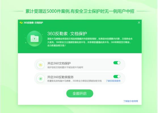 面对严峻的勒索形式,360安全卫士独家发布了集免疫、防御、查杀、解密、赔付于一体的完整解决方案。以五大针对性的防御技术为根本,以“反勒索服务”、“解密大师”两大功能为核心,从病毒可能造成危害的各个场景出发,层层设置拦截关卡,并提供修复策略,为用户打造了一个全方位的防勒索矩阵。