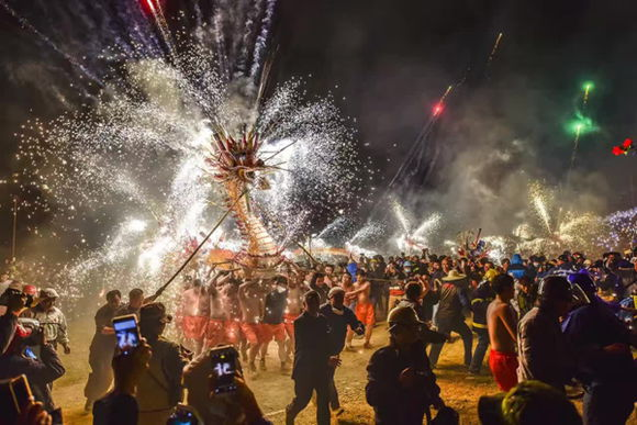 埔寨烧火龙已有三百年历史,火龙制作是由竹篾、稻杆扎成龙的形状,以硫磺、白硝、木炭末配成的火药,制成火箭、火花等燃放,经过几百年来的不断演变,火龙由原来的三、四段发展到如今的十一段,长达三十余米在龙身上安装烟花、炮竹、火箭多达数千枚,龙头、龙尾装的火药更数不胜数。一条火龙由三四十个赤膊青年手擎,加上鼓乐手、龙虾、金鱼等人,整个队伍达200多人,表演奇特,惊险壮观。像丰顺埔寨这样的“烧龙”,由村民自发筹款,志愿制作,舞龙时赤裸上身,舞着的龙身烟花绽放、火箭飞射,不惧烫出泡来的民俗,对比全国的“烧龙”,堪称“奇特”。