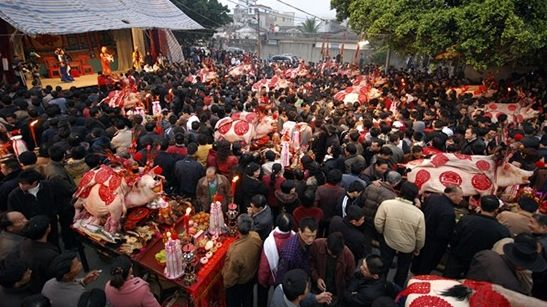 赛大猪是一种传统民间庆丰年的仪式,像平时时年过节拜神祈求五谷丰登、六畜兴旺有同样的意义。只是其仪式之隆重,场面之壮观实为罕见,加之“赛大猪”的方式有着促进生产。繁荣经济的积极意义,遂成为远近闻名的一大盛事。主要流行于广东潮汕地区和福建闽南地区,而最壮观的就在汕头市了。赛大猪在潮汕地区没有统一的日子,都是各村有自己特定的日子,在正月举行且较为出名的有冠山赛大猪及月浦着丁头赛大猪。