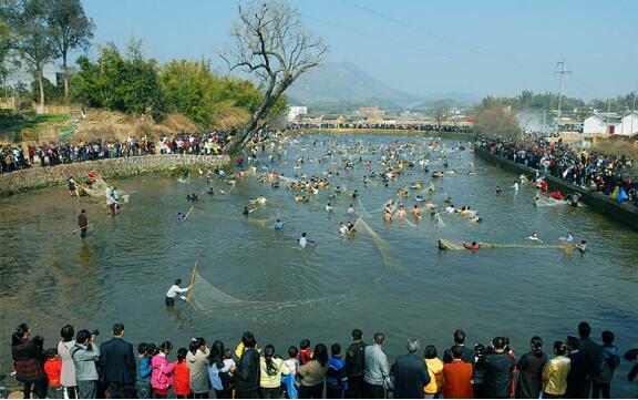 每年大年初三,河源市东源县漳溪畲族乡都会举办“捕鱼节”。据当地村民介绍,中联村大年初三举办的这项活动是由他们的祖辈相传下来的,具体年代不详,迄今已有数百年的历史了。“鱼”与“余”同音,寓意“年年有余”,“捕鱼节”的兴起历经几百年而不衰,与这民俗文化有着紧密联系。不管天有多冷,村民们全然不顾,热情地投身到水塘中进行捕鱼比赛。一时间,被惊动的鱼群纷纷跃出水面,捕鱼者挥动手中鱼网,来回穿梭,很快就有收获。从鱼塘中捕到的鱼,不管大小均归各家所有,在规定的时间内,如果捕获塘鱼数量最多、重量最大的前三名村民,还可获得村委会的物质奖励。