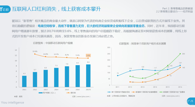 被冠以“新零售”相关概念的商业最大动作,就是以阿里为代表的电商企业投资或收购线下企业,以自营或联营的方式开展线下业务。其背后隐藏的逻辑是:电商空间收窄,而线下零售潜力无穷,巨大的经济利益驱使企业转向发展新零售业态。同时,近年来,我国移动互联网用户增速逐年放缓,预计2017年将降至3.6%,线上零售面向的用户总规模趋于稳定,而根据海通证券对阿里获客成本的测算,纯线上形式的开发客户成本已经越来越高,因而,探索零售业的新业态发展已成必然之势。