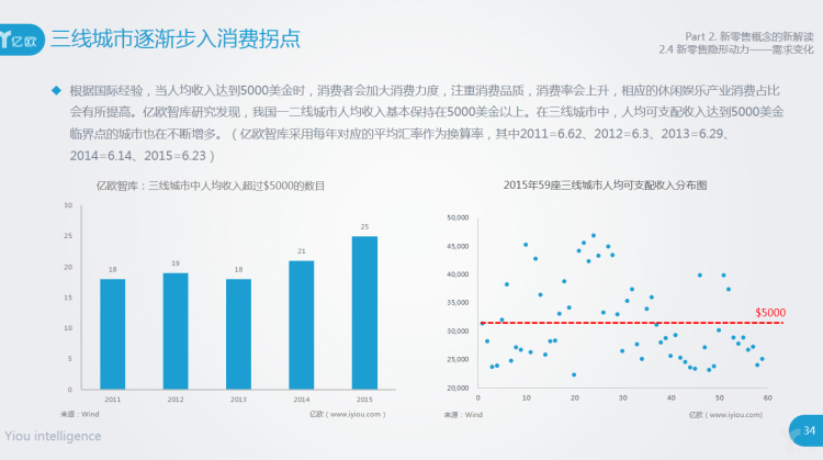 根据国际经验,当人均收入达到5000美金时,消费者会加大消费力度,注重消费品质,消费率会上升,相应的休闲娱乐产业消费占比会有所提高。亿欧智库研究发现,我国一二线城市人均收入基本保持在5000美金以上。在三线城市中,人均可支配收入达到5000美金临界点的城市也在不断增多。(亿欧智库采用每年对应的平均汇率作为换算率,其中2011=6.62、2012=6.3、2013=6.29、2014=6.14、2015=6.23)