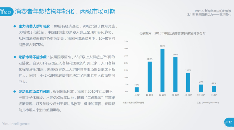 消费需求是新零售的牵引力,消费者的变化代表着市场的变化,自然也是新零售所要跟随的趋势。消费者变化主要体现在消费者结构变化、消费升级带来的消费需求和偏好变化。其中,消费者结构变化包括消费者年龄结构以及地理结构的变化。