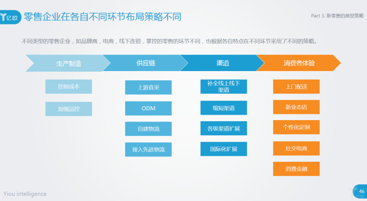 不同类型的零售企业,如品牌商,电商,线下连锁,掌控的零售的环节不同,也根据各自特点在不同环节采用了不同的策略。
