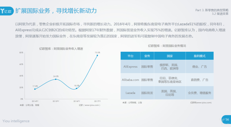 以阿里为代表,零售企业积极开拓国际市场,寻找新的增长动力。2016年4月,阿里收购东南亚电子商务平台Lazada51%的股权,同年8月,AliExpress完成从C2C到B2C的成功转型。根据阿里17年财务数据,其国际贸易业务收入实现75%的增速。亿欧智库认为,国内电商收入增速放缓,阿里逐渐开始发力国际业务,在东南亚等发展较为落后的国家,阿里的进军有可能复制中国电子商务的发展态势。