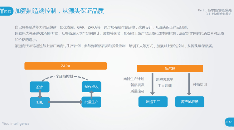 自己具备制造能力的品牌商,如优衣库、GAP、ZARA等,通过加强制作端品控,改进设计,从源头保证产品品质。网易严选等通过ODM的方式,从渠道深入到产品的设计、质检等环节,加强对上游产品品质和成本的控制,满足新零售时代消费者对品质和价格的追求。