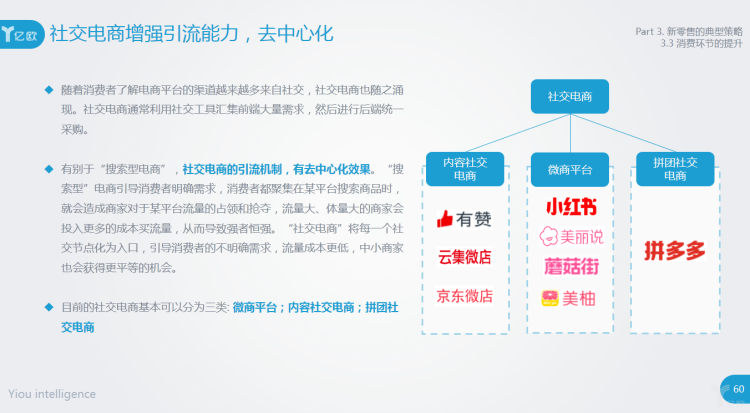 随着消费者了解电商平台的渠道越来越多来自社交,社交电商也随之涌现。社交电商通常利用社交工具汇集前端大量需求,然后进行后端统一采购。
