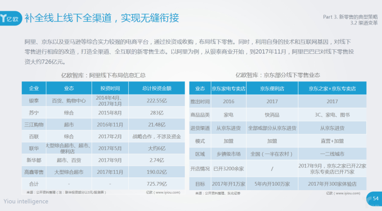阿里、京东以及亚马逊等综合实力较强的电商平台,通过投资或收购,布局线下零售。同时,利用自身的技术和互联网基因,对线下零售进行相应的改造,打造全渠道、全互联的新零售生态。以阿里为例,从银泰商业开始,到2017年11月,阿里巴巴已对线下零售投资大约726亿元。