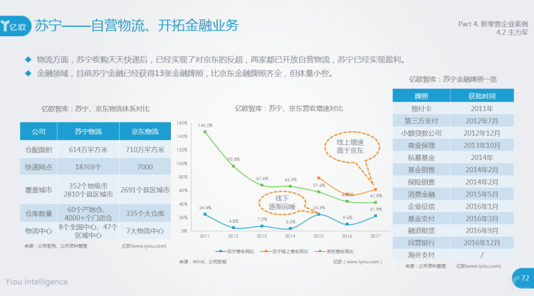 物流方面,苏宁收购天天快递后,已经实现了对京东的反超,两家都已开放自营物流,苏宁已经实现盈利。金融领域,目前苏宁金融已经获得13张金融牌照,比京东金融牌照齐全,但体量小些。
