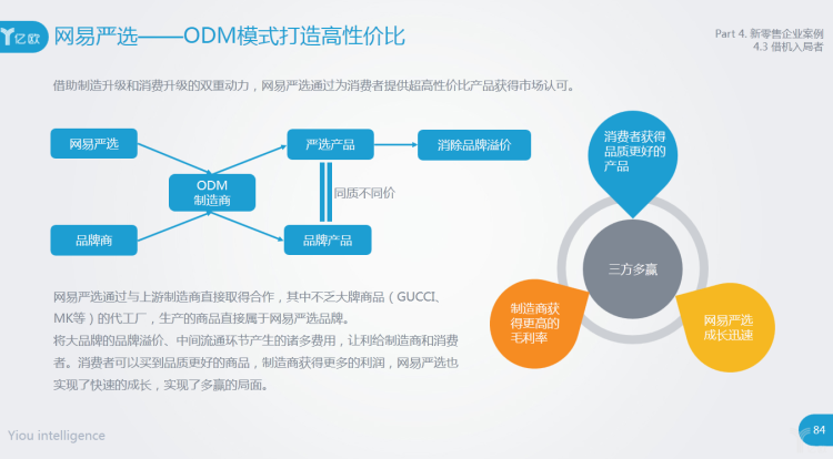 网易严选——ODM模式打造高性价比。网易严选通过与上游制造商直接取得合作,其中不乏大牌商品(GUCCI、MK等)的代工厂,生产的商品直接属于网易严选品牌。通过将大品牌的品牌溢价、中间流通环节产生的诸多费用,让利给制造商和消费者。消费者可以买到品质更好的商品,制造商获得更多的利润,网易严选也实现了快速的成长,实现了多赢的局面。
