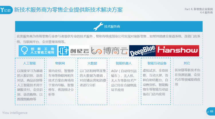 新技术服务商为传统零售行业参与者提供专业的技术服务,帮助传统或创业公司实现对接新零售,如帮其搭建全渠道系统、连锁门店系统、互联网平台、会员管理系统等。