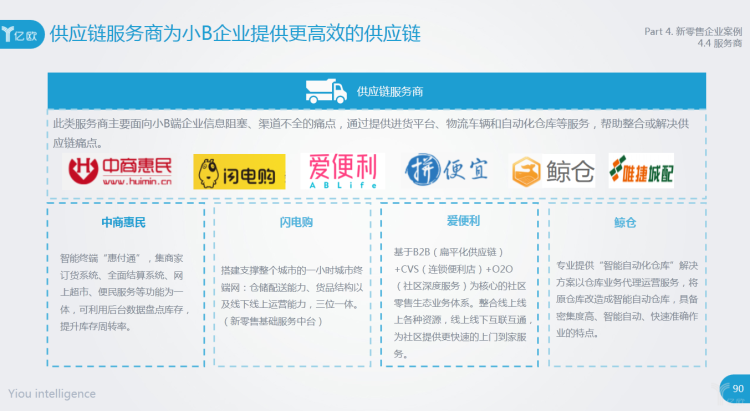 供应链服务商主要面向小B端企业信息阻塞、渠道不全的痛点,通过提供进货平台、物流车辆和自动化仓库等服务,帮助整合或解决供应链痛点。