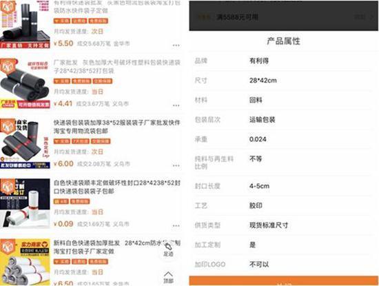 在阿里巴巴的1688采购批发平台上,记者也得到了相关印证。通过对关键词“快递袋”的搜索,数十家生产厂家排列开来,选取用按销量排序,最高的则成交累计成交300余万包,其快递袋的明显来源为“回料”,即回收料。