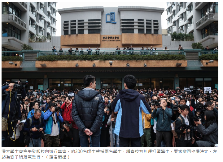24日,浸大校长钱大康宣布,对涉嫌在“占领抗议”期间恐吓老师的两名学生采取暂时停学处理,即浸大学生会会长刘子颀和该校五年级学生陈乐行。对于校方的这一决定,浸大学生会表示不满,并于25日早上在脸书发帖,要在26日在校内发起游行集会。