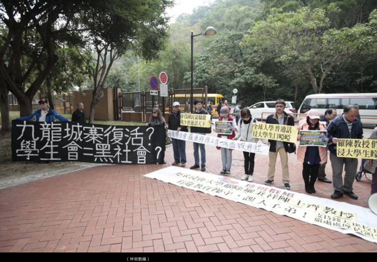 在游行前夕,民间团体“珍惜群组”约十多名成员到浸会大学校园高举印有“九龙城寨复活?学生会=黑社会?”的黑色横幅,抗议学生当日的“占领”行动,支持校长钱大康将涉事学生停学的决定。