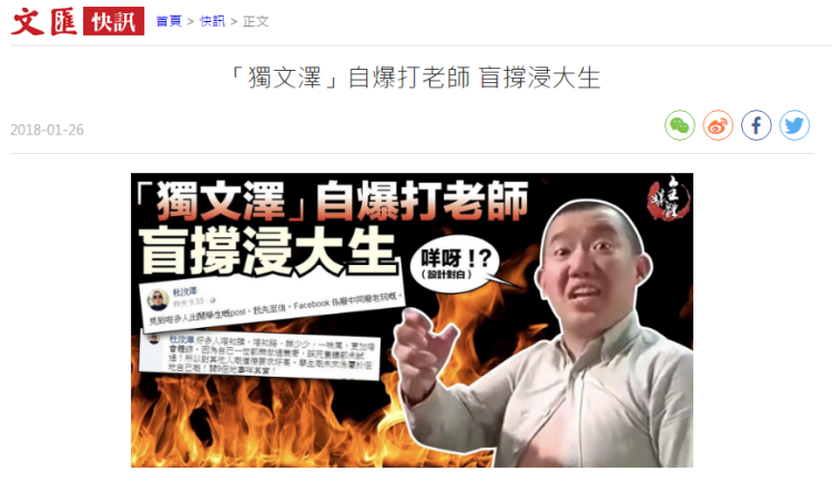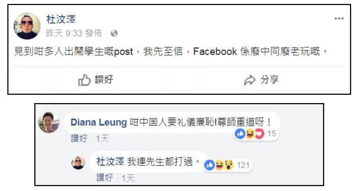 昨日,杜汶泽在脸书挑衅称,见到这么多人指责学生,才相信脸书是思想简单的中年、老年人玩的,更自爆“我连先生都打过”(我连老师都打过)。