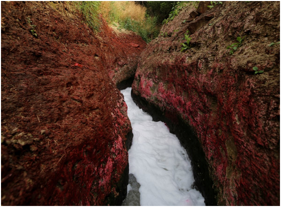 顺着河流往下,污水上方形成了泡沫层。