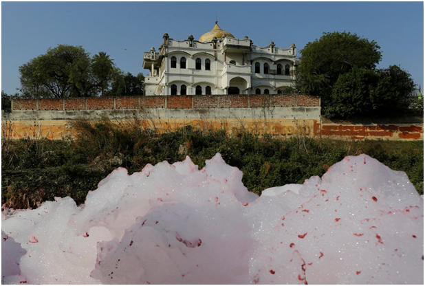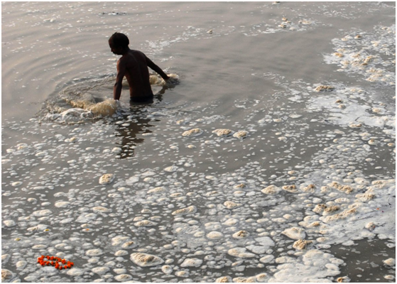 人们在受到污染的恒河上洗浴、做饭、洗涤。图为北方邦一个男孩在污水泡沫中洗澡。