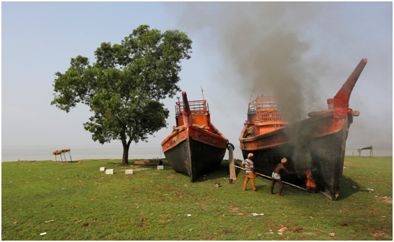 图为工人在修理船只。