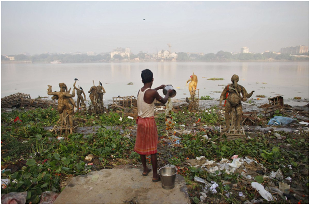 印度传统节日杜尔迦女神节(Durga Puja)当天,一名男子在印度教女神和神灵旁边将“圣水”倒向受到污染的恒河河岸。