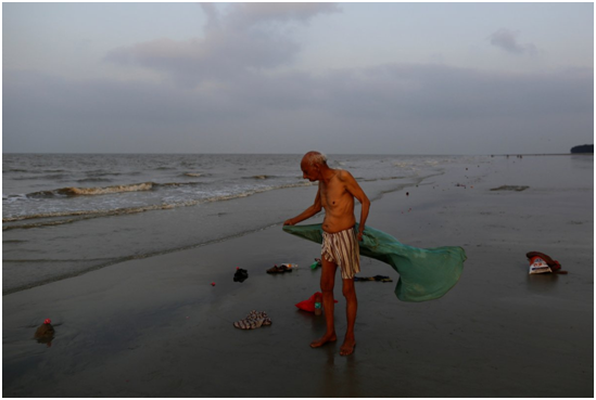 朝圣者不顾海滩上的垃圾,在河里游泳使自身得到精神净化。图为一个老人来到恒河的入海口—孟加拉湾。