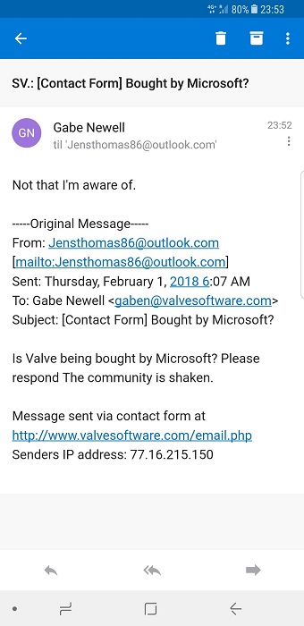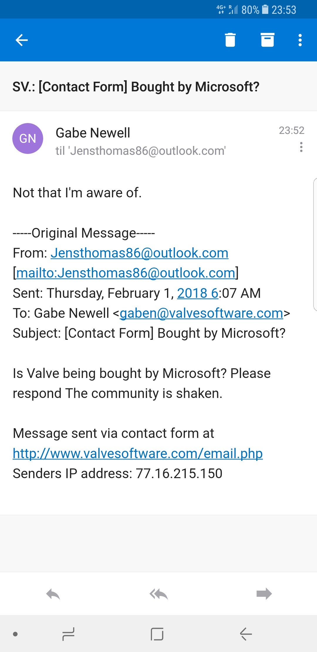 某位 V 社粉丝向 Gabe Newell 发去的问询 ——“贵司要被微软收购的传闻已经震惊了业界”。