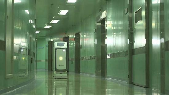 在华中科技大学同济医学院附属协和医院(以下简称“武汉协和医院”),这台物流机器人是手术区医护人员的新同事。它已上岗一年多,完全包揽了从库房向手术室配送高值耗材的任务。
