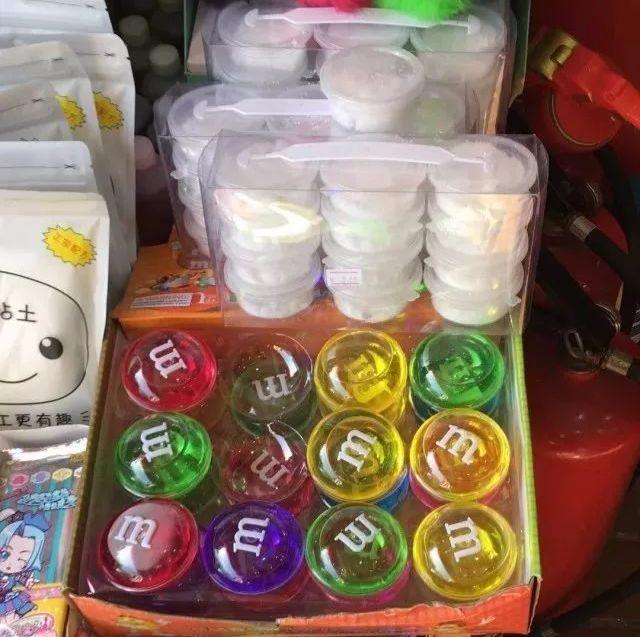 在一家店铺中,一些自制水晶泥产品包装粗糙,而且没有任何说明及产品信息。