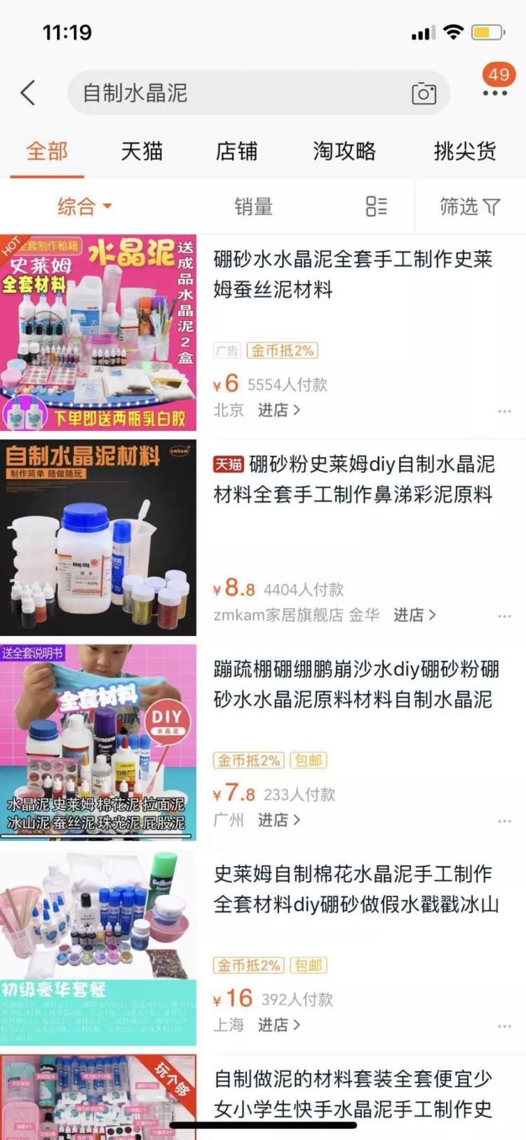 销量排名靠前的一家网店中,“史莱姆”材料包的售价为49元。记者阅读产品介绍后发现,材料包包含25g硼砂、硼砂水以及色彩各异的闪粉。