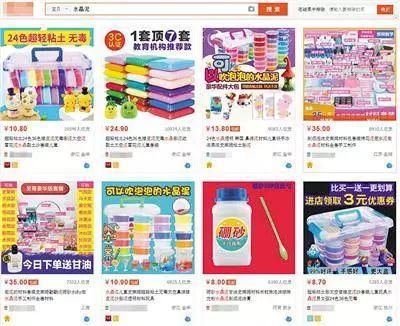在网购平台搜索“史莱姆水晶泥”,出现不少出售自制“史莱姆”水晶泥材料包的商店。记者观察发现,多家商店的材料包中,包含硼砂或者硼砂水。一些硼砂水甚至直接表明,可以用于水晶泥制作材料使用。