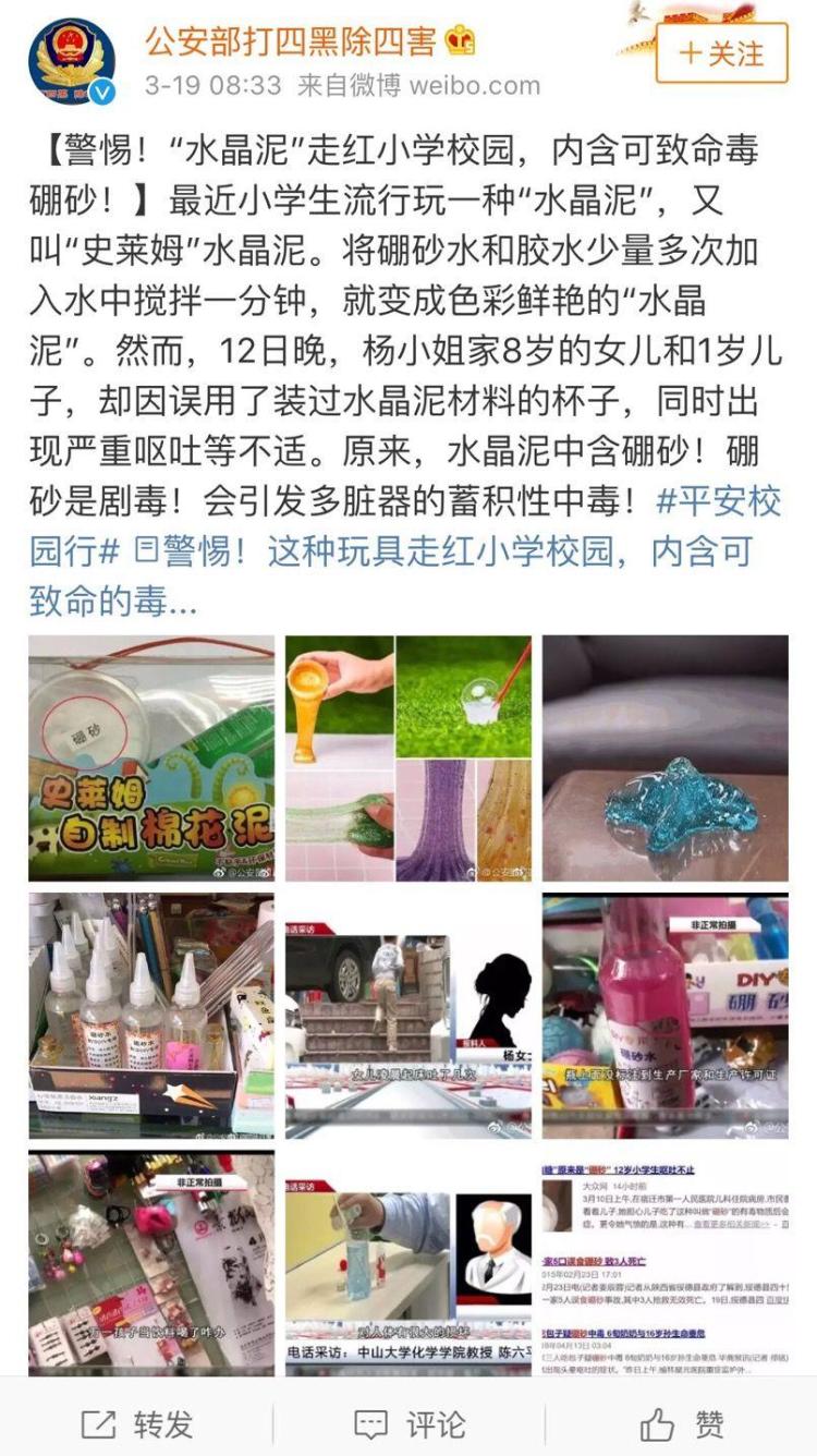 通过上述视频可知,“自制水晶泥”是存在中毒可能的。公安部打四黑除四害也在微博发布消息,警惕“水晶泥”走红小学校园,内含可致命毒硼砂!