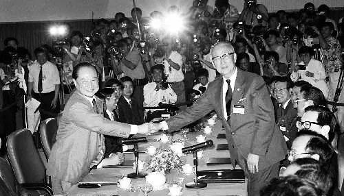 1993年4月27日“汪辜会谈”前汪道涵(左)与辜振甫握手的资料照片。