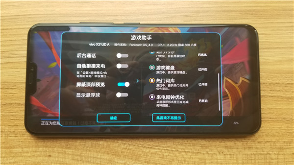 对于游戏模式,由于vivo是腾讯《王者荣耀》的合作伙伴,因此饱受好评。vivo X21可以把常用的游戏后台关闭级别放至最低。这样就不会让用户切出游戏再进入就重启游戏的尴尬重现。另外,游戏模式下,手机的性能开启到最大,可以流畅的使用。当然防止打扰,游戏键盘、自动拒绝来电等功能也都十分有用。