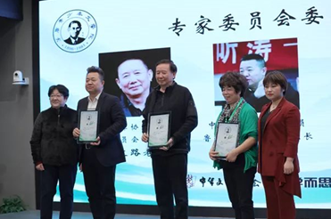 中华文学基金会秘书长李小慧(左一)、学而思大语文负责人李林(右一)为著名作家邱华栋、张之路、袁敏(分别为左二,左三,左四)颁发专家委员会委员聘书