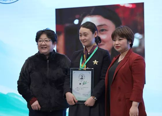 中华文学基金会秘书长李小慧(左一)与学而思大语文负责人李林(右一)为青年作家马小淘(中间)颁发茅盾青少年文学院授课教师聘书