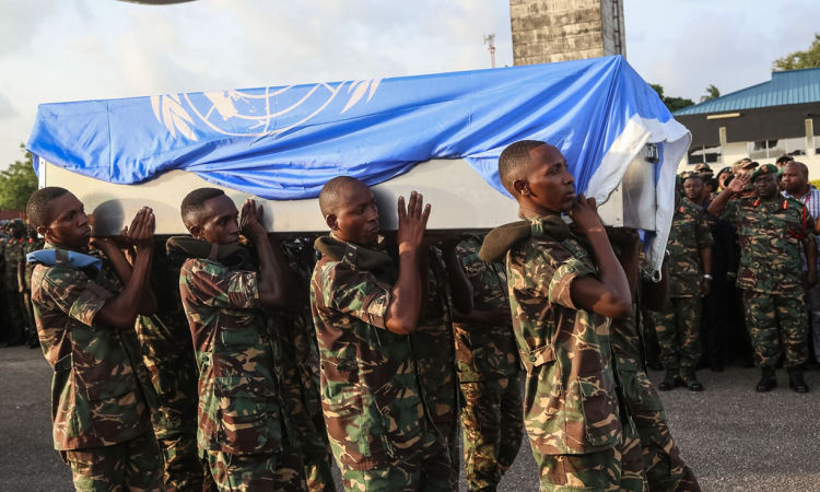 达累斯萨拉姆(Dar es Salaam)空军基地,坦桑尼亚军人在运送于去年11月牺牲的该国维和士兵灵柩。图片来源:法新社/Getty Images