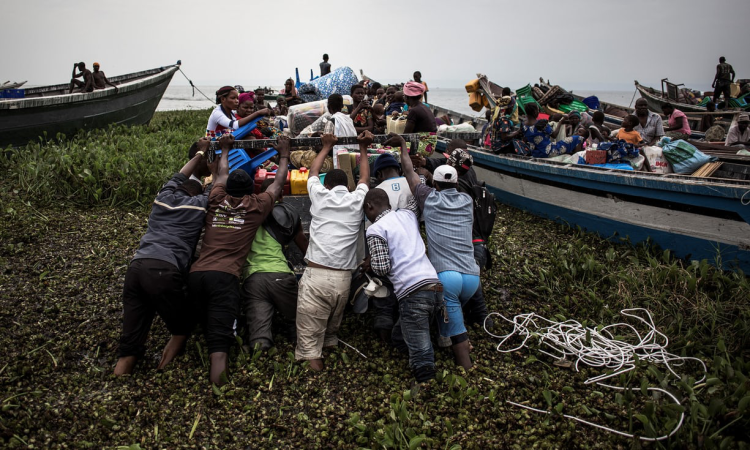 流离失所的刚果难民将一条船推向阿尔伯特湖(Lake Albert)里,他们想经此逃向乌干达,远离暴力。图片来源:法新社/Getty Images 摄影师:约翰·维塞尔斯(John Wessels)