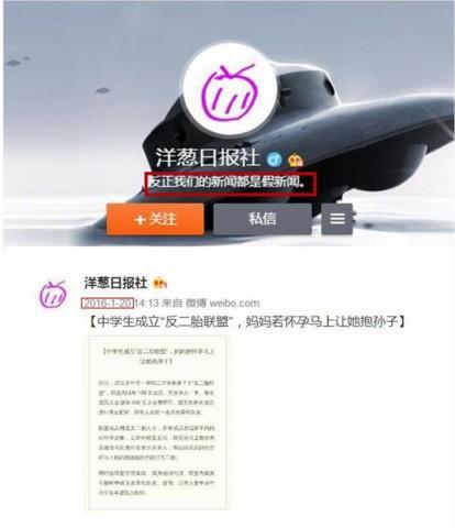 【真相】早在2016年1月20日,一个名为“@洋葱日报社”的微博账号就曾发布过这张图片。而在该微博账号的自我介绍中,注明“反正我们的新闻都是假新闻”。所谓的“武汉中学生反二胎联盟”的传闻,是一条已被发布过的“洋葱新闻”(以幽默手法炮制的假新闻),今年这条恶搞旧闻被再次“炒冷饭”。