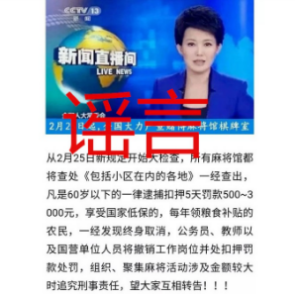 【传闻】央视新闻报道,从2月25日新规定开始大检查, 所有麻将馆都将查处(包括小区之内)。凡是60岁以下的一律逮捕拘留5天罚款500-1000元。