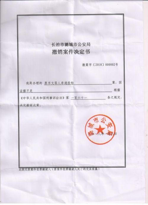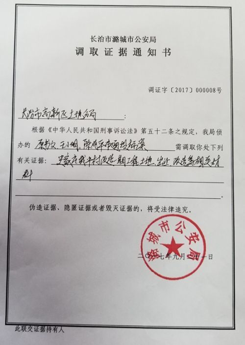 “2017年,我被长治市潞城市公安局以‘串通投标罪’进行调查。我觉得公安局的调查没那么简单,是不是和我拒绝程某英索要土地和房屋事情有关系。但在2012年10月的公开招拍挂现场,她作为高新区纪工负责人是全程监督的,这都过去五年了,怎么又说我是串通投标呢?而且,为什么是潞城市公安局立案而不是高新区公安局呢?在整个调查过程中,我虽然配合了调查但并未收到过任何书面通知,即使是后来潞城市公安局以证据不足撤销了对此案的调查,我也始终未收到任何文书。”陈兆平表示,他手里的潞城市公安局向高新区土地分局和史家庄村委送达的其涉嫌串通投标罪的调取证据通知书以及撤销案件决定书,也都是后来获得的。