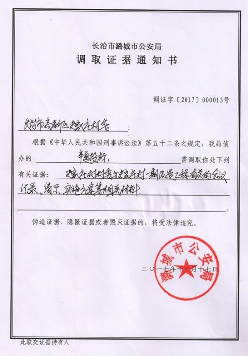 为弄清这一事件,记者采访了潞城市公安局法制办公室赵主任,他表示:“我不了解这个情况,这个案子是纪检委安排到长治市公安局,长治市公安局指定到潞城市公安局办案的。实际上不是潞城市公安局的管辖,是长治市公安局指定的。具体细节我不知道。”而在潞城市公安局一位工作人员的协助下,他告知记者,经过电话联系,潞城市公安局经侦大队常大队长表示:“我不知道这个案子,是长治市公安局自己办的案子,指定到潞城市公安局,从这出手续的。”当记者提出采访办理此案的两名民警时,这位工作人员表示:“两名民警去太原培训了,我也不知道他们的联系方式。”