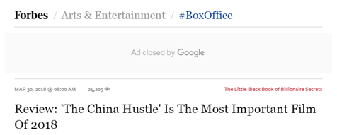 【环球网报道 记者 张骜】不久前,美国拍了一部以中国为主题的纪录片,名字很有噱头——《中国骗局》。美国福布斯网站上的影评甚至称这部片子为“2018年最重要的影片”,让你了解什么是中国“史上最大金融骗局之一”。