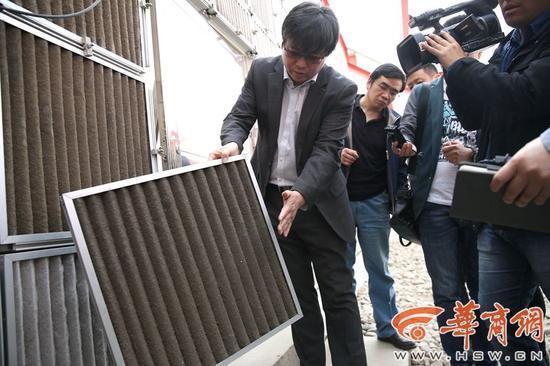 塔身的四周,是透明玻璃的屋顶。屋顶下,围绕着塔身的三面墙上,布满了过滤材料,就像空气净化器使用的过滤网一样。据介绍,三面墙分别是三种不同的过滤材料,以检测各自的效能。华商报记者分别摸了摸几种过滤材料,满手都是灰,其中清洗过的过滤材料和未清洗的,几乎是一白一黑的对比。