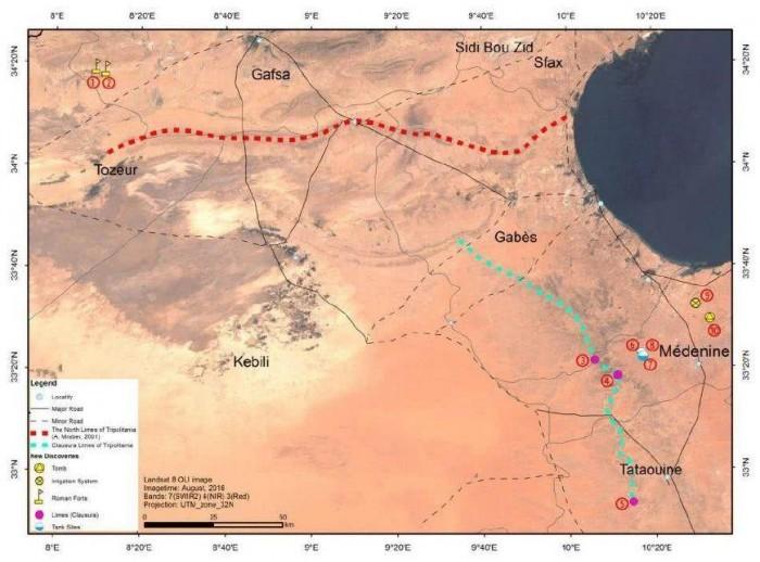 此次联合考古历经2年,2016年3月,科学家开始进行室内遥感图像处理以及解译分析,进而发现目标物——疑似遗址点,然后分别于2017年4月、11月和2018年4月与当地考古专家联合进行实地调研与验证,最后在突尼斯南部确定空间考古新发现10处古罗马时期遗存,包括边墙3段(Limes)、军事堡垒(Forts)2个,以及农业灌溉系统1处、水窖3处、墓葬1处。这些考古遗存形成证据链条反映出古罗马时期帝国南部边疆的军事防御体系。