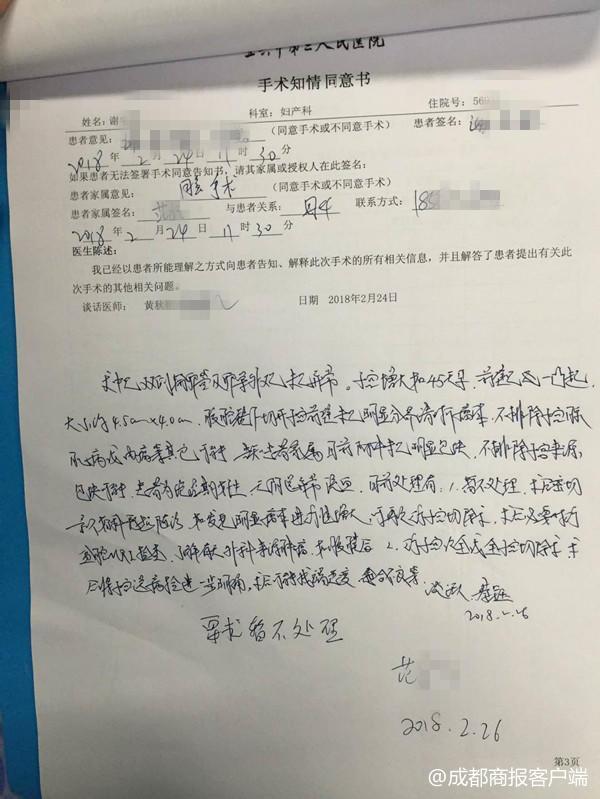 家属提供的《手术知情同意书》记载:谢女士手术中“未见明显分界清晰瘤体”,在文书下方医生书写了手术情况说明,并给出了“暂不处理”与“行子宫切除术送病检进一步明确”两个选择。范小姐签上了“要求暂不处理”六个字。