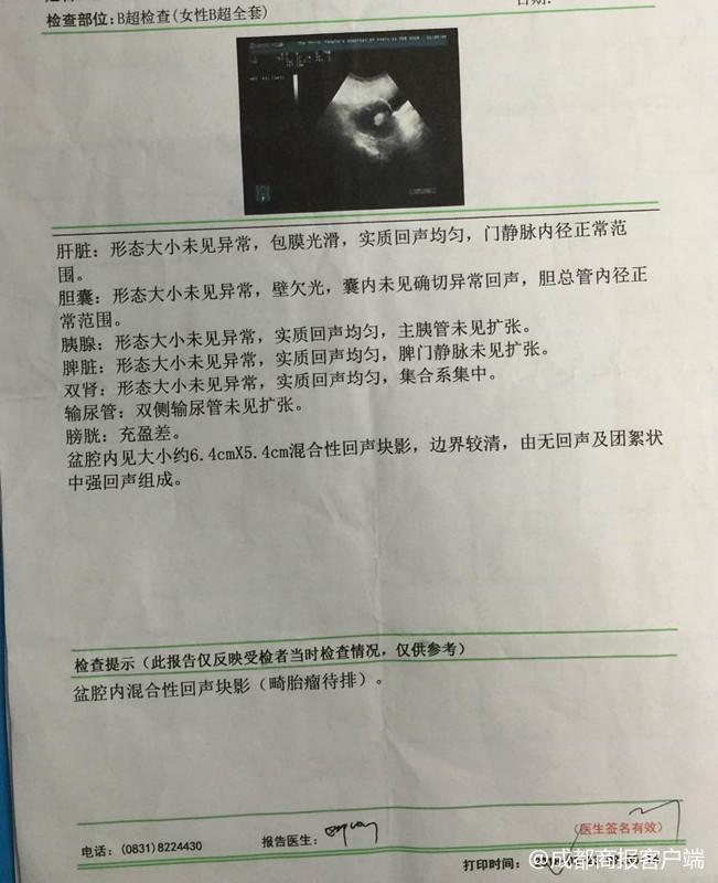 据谢女士的女儿范小姐介绍,谢女士是宜宾市翠屏区思坡乡人,此前一直在广州工作。今年2月23日,回家过年的谢女士被女儿带到当地二甲医院宜宾市第三人民医院体检。经腹部B超检查,发现“盆腔内见大小约6.4cmX5.4cm混合性回声块影,边界较清,由无回声及团絮状中强回声组成。”