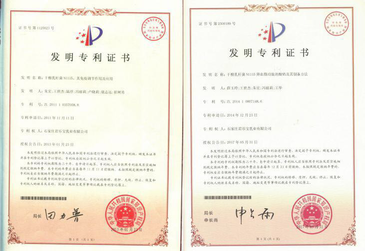 正是基于这一系列科学严谨的步骤,N1115分别于2013年和2017年获得“干酪乳杆菌N1115、其免疫调节及应用”和“干酪乳杆菌N1115降血脂功能的酸奶及其制备方法”两项发明专利证书(专利号:ZL2011 10357058.8,专利保藏号:CGMCC No.4691)。中国专利法规定可以获得专利保护的发明创造有发明、实用新型和外观设计三种,其中发明专利是最主要的一种。中国专利法实施细则中指出“专利法所称的发明是指对产品、方法或其改进所提出的新的技术方案”。发明人只有将这种技术方案向专利局提出申请,并且通过一系列严格的审查,特别是新颖性、创造性和实用性的审查,才可以获得发明专利授权。