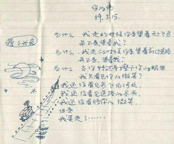 王伟在他休息日的时候给我写过一支歌,他用自己学外语的录音机录下来寄给我。歌词大概是:“窗外下着纷飞的小雨,灯下是无尽的思念,面对你那甜甜的笑脸,话到嘴边又难诉说。天涯的尽头是你期盼的等候,苦盼的人儿他何时归否?总会有一天,我会回到你身边,拥抱心爱的人儿永不分开……”