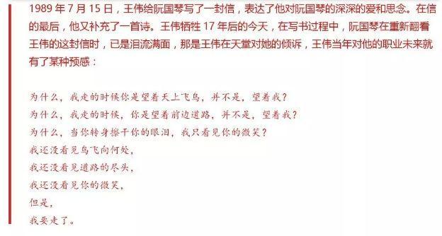 原来,王伟的部队在进行跳伞训练时出了一次事故,一名学员牺牲,这使王伟对飞行员这项职业的危险性有了更加直接和现实的认识。他热爱飞行事业,但又怕将来自己有个万一给自己心爱的人带来痛苦。他想,长痛不如短痛,那就把痛苦留给自己吧,但又怕我们之间的感情太深,双方都下不了这个决心,于是就在信中编造了一个根本就不存在的“女大学生”。就是在这样一种矛盾的心情下,王伟从北国的军营发出了那封“绝情”信。