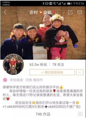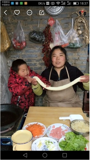 农村会姐的快手号是2016年7月申请的,刚开始上传的内容五花八门,时断时续,粉丝量也很少。2017年下半年开始,会姐专门上传每天做饭给孩子吃的视频,粉丝量迅速上升。现在,会姐的粉丝涨到了63.5万。农村会姐究竟靠什么吸引来这么多关注者呢?